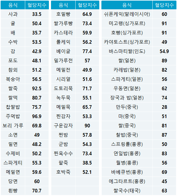 아시아인에 맞는 혈당지수 리스트 나왔습니다.