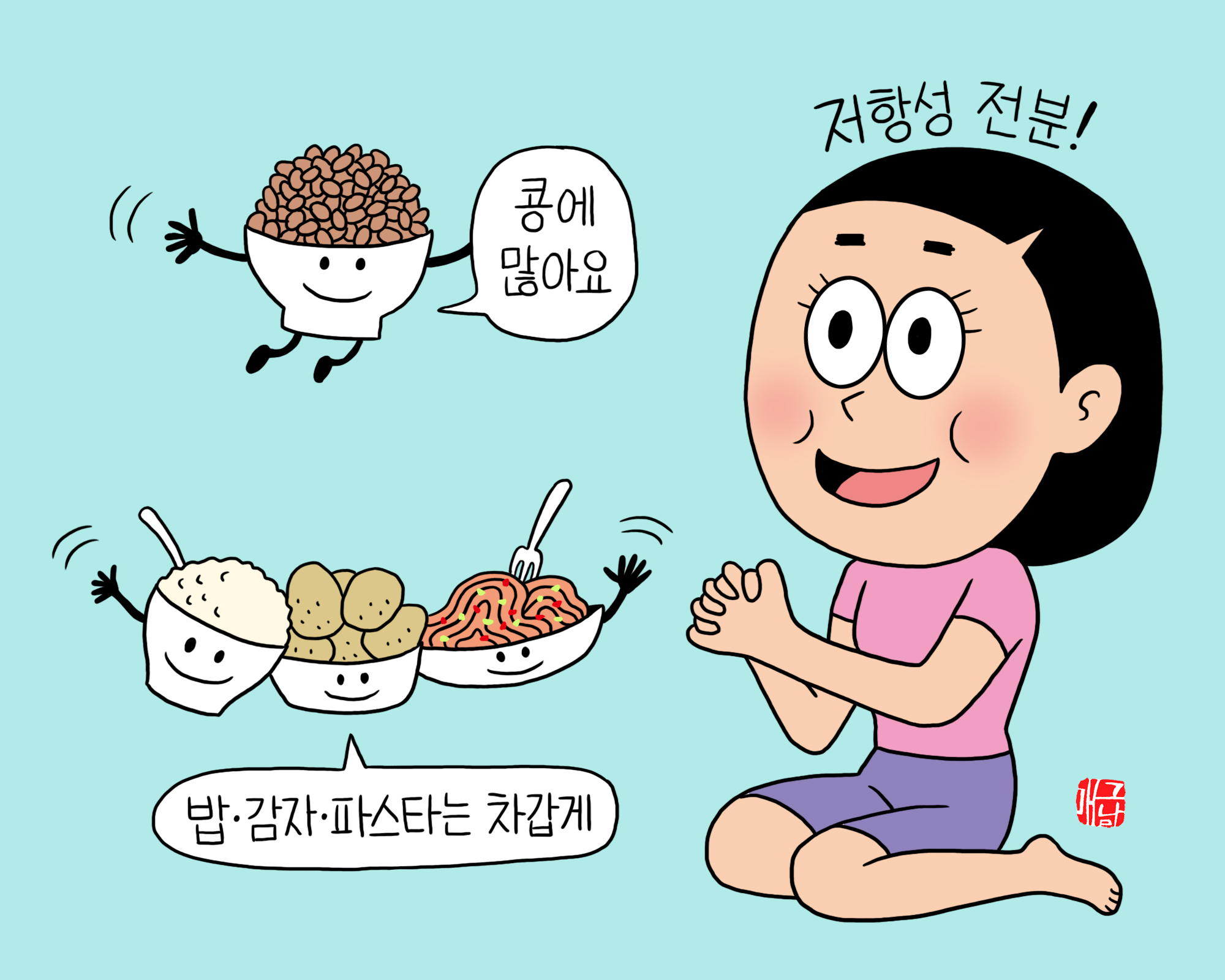 저항성 전분이 좋다고 해서 이것만 먹으면 안 됩니다. 영양 균형이 깨지기 때문입니다. 박정환 교수는 “하루 동안 먹는 전체 음식의 50%를 탄수화물로 구성하되, 이를 저항성 전분이 많은 식품으로 채우라”고 말합니다. 콩, 현미, 보리, 통밀, 감자(익힌 후 식힌 것), 바나나(덜 익은 것)에 저항성 전분이 풍부합니다.