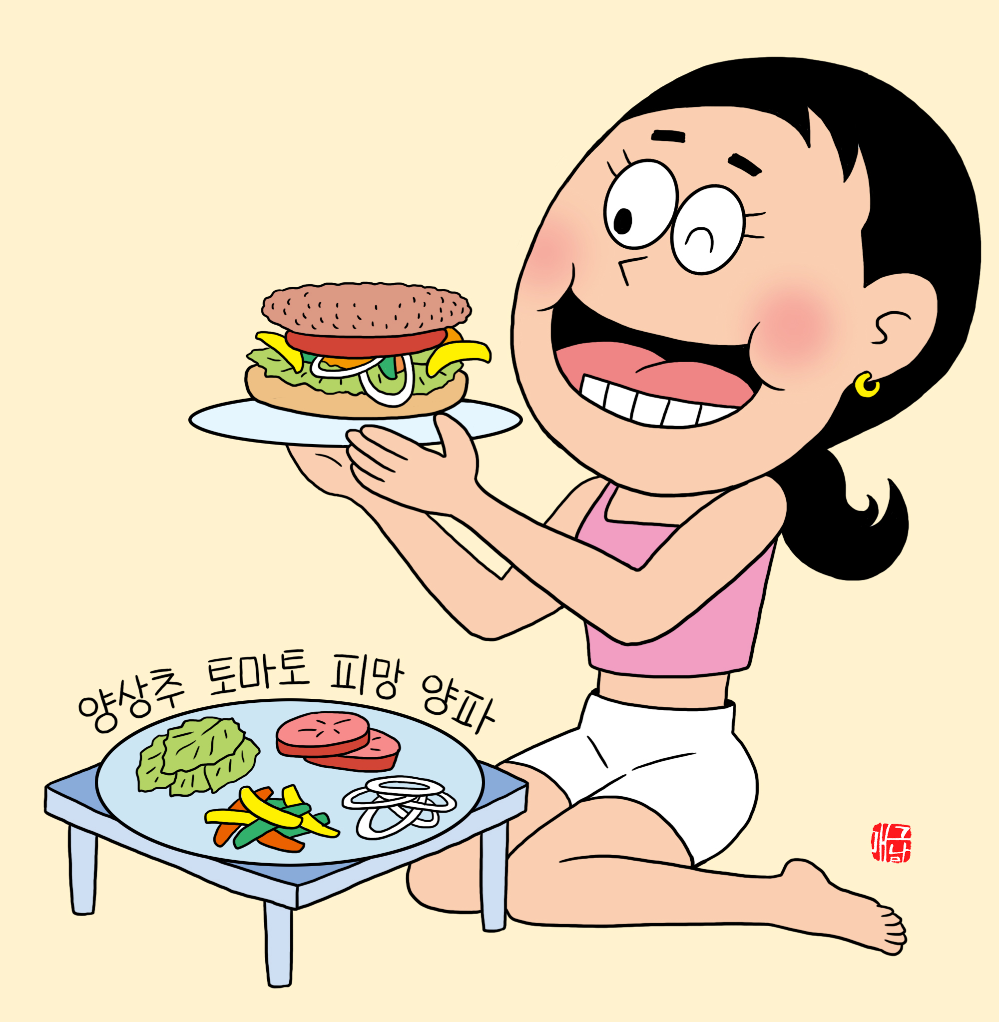 - 햄버거 빵, 양상추, 양파, 토마토, 피망 순으로 올린다. (기호에 따라 머스터드나 케첩 살짝 바르기)