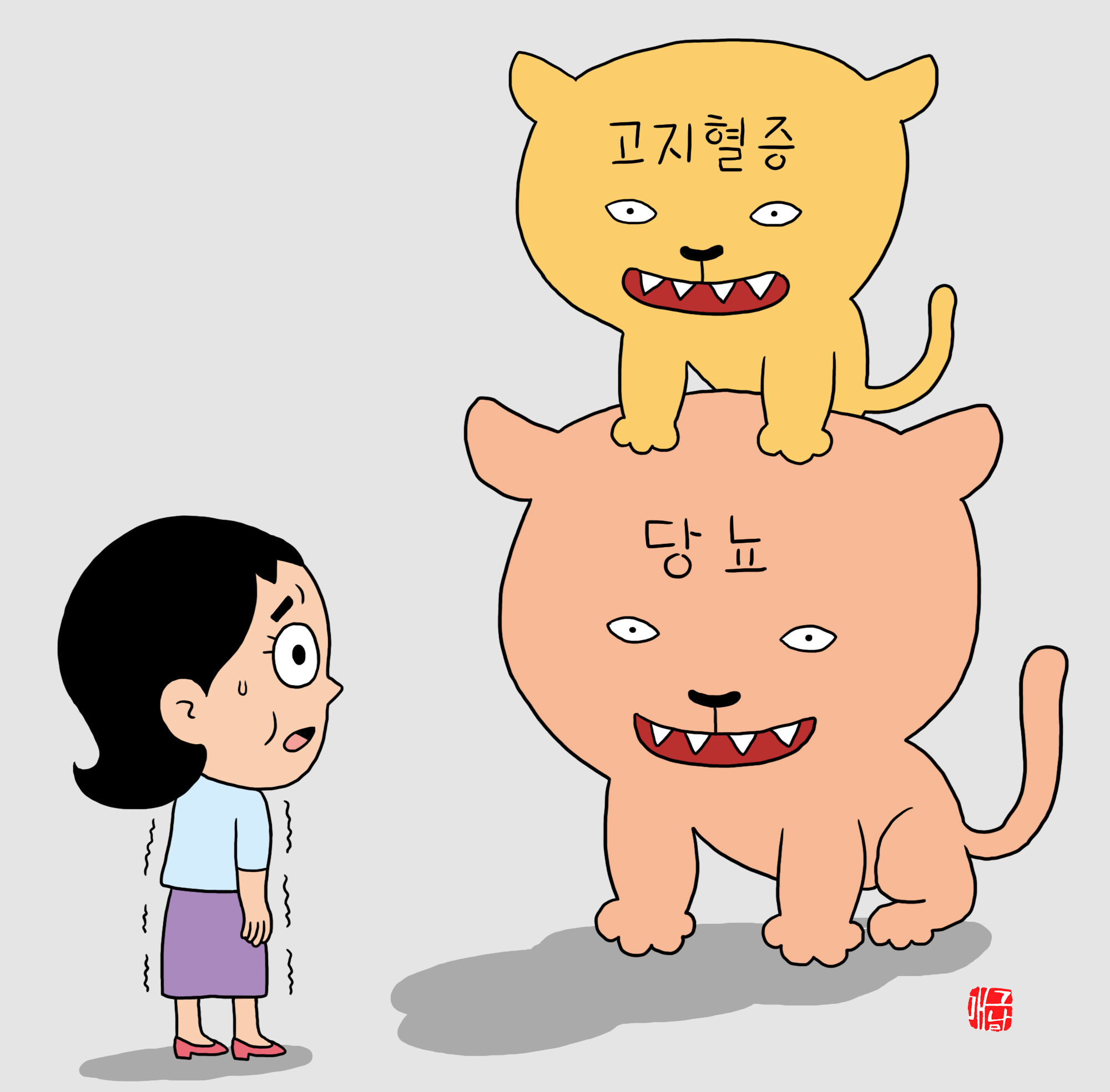 대한당뇨병학회 자료에 따르면 당뇨 환자 72%는 고콜레스테롤혈증을 동반하고 있습니다. 고콜레스테롤혈증은 LDL콜레스테롤 수치가 100mg/dL 이상인 경우를 말합니다. 성인 당뇨 환자 4311명을 대상으로 분석한 결과, 83%가 고지혈증(콜레스테롤 외에 중성지방 농도가 증가한 경우도 포함합니다!)을 함께 갖고 있다는 결과도 있습니다. 특히 여성 당뇨 환자들의 고지혈증 동반율은 88.3%로 남성(78.1%)보다 높습니다. 하지만 당뇨 환자 중 본인이 고지혈증을 갖고 있다는 사실을 아는 경우는 드뭅니다. 36.5%만이 인지하고 있고, 26.9%에 해당하는 환자만 고지혈증 치료를 받고 있습니다. |