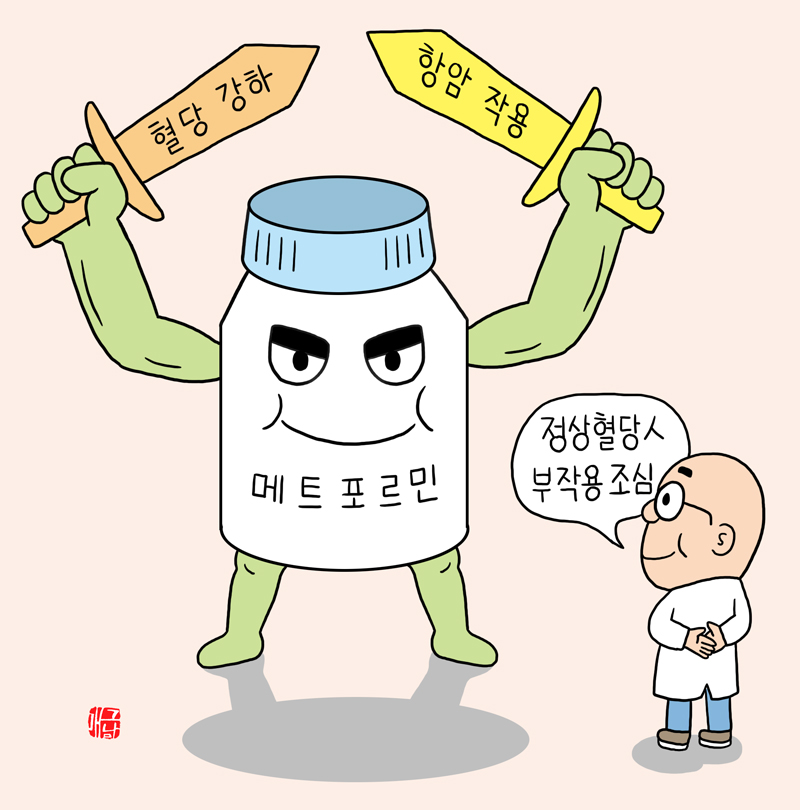 그렇다면 암 치료를 목적으로 메트포르민을 쓸 수 있는 걸까요? 아직은 조심스럽습니다. 혈당 문제가 없는 사람이 암 치료만을 위해 메트포르민을 썼을 때 생기는 문제는 없는지 등 해결되지 않은 숙제가 아직 많습니다. 신장 기능이 안 좋으면 메트포르민이 대사가 안 돼 오히려 유산산증(젖산이 증가함에 따라 신진대사가 저하되는 상태) 같은 부작용을 겪을 위험도 있습니다. 김진택 교수는 “혈당에 관계없이 메트포르민과 암의 관련성을 살피는 장기간의 대규모 추적 연구가 필요하다”며 “지금 상태로는 주치의와 잘 상의해 결정할 수는 있을 것”이라고 말했습니다. 많은 연구자들이 메트포르민이 항암 효과를 내는 명확한 기전, 유전적 차이에 따른 메트포르민의 효과 등이 밝혀지면 메트포르민이 추후 암치료제로 거듭날 수 있을 것이라고 기대를 모으고 있습니다.