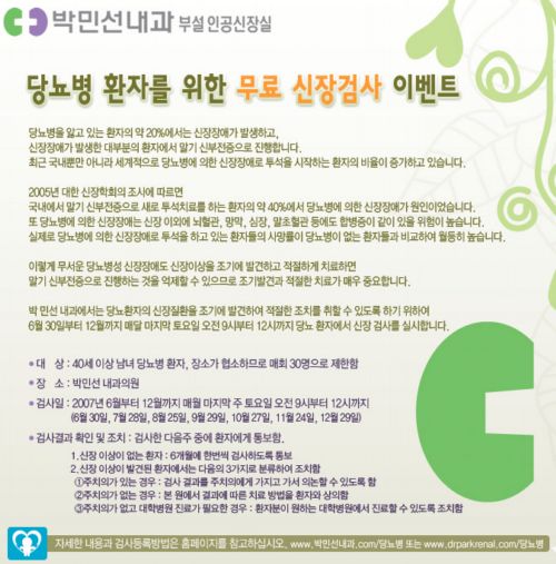¹Ú¹Î¼±³»°ú ºÎ¼³ Àΰø½ÅÀå½ÇÀº ´ç´¢º´ ȯÀÚ¸¦ ´ë»óÀ¸·Î ¹«·á ½ÅÀå°Ë»ç¸¦ ½Ç½ÃÇÑ´Ù. ´ë»óÀº 40¼¼ ÀÌ»ó ´ç´¢º´ ȯÀÚÀ̸ç 12¿ù±îÁö ¸Å¿ù ¸¶Áö¸·ÁÖ Åä¿äÀÏ ¿ÀÀü 9½ÃºÎÅÍ 12½Ã±îÁöÀÌ¸ç ¸Åȸ 30¸íÀ¸·Î Á¦ÇÑÇÑ´Ù. °Ë»çÀÏ : 6¿ù 30ÀÏ, 7¿ù 28ÀÏ, 8¿ù 25ÀÏ, 9¿ù 29ÀÏ, 10¿ù 27ÀÏ, 11¿ù 24ÀÏ, 12¿ù 29ÀÏ ¹®ÀÇ : 02-568-7755 / www.drparkrenal.com
