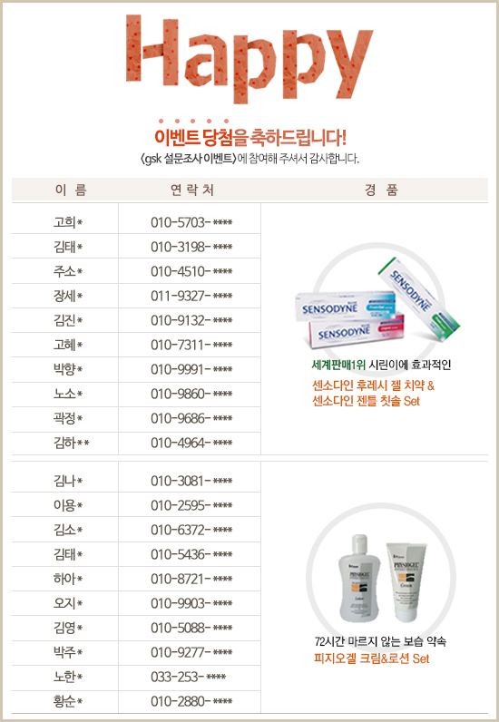À̺¥Æ® ÀÀ¸ðÀÚÁß ´ç÷ÀÚ 20ºÐÀÌ ¼±Á¤ µÇ¾úÀ¸¸ç ¸í´ÜÀº °¢°¢ ¾Æ·¡¿Í °°½À´Ï´Ù.(°³ÀÎÁ¤º¸ º¸È£¸¦ À§ÇØ, À̸§ ¹× ÀüȹøÈ£ÀÇ ³¡ÀÚ¸®´Â ºí¶óÀεå ó¸® ÇÏ¿´½À´Ï´Ù)