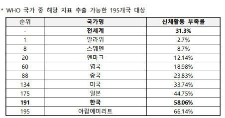 ´Ù¸¸ Àü ¼¼°è Æò±Õ°ú ºñ±³ÇßÀ» ¶© ºÎÁ·ÇÑ ¼öÄ¡´Ù. WHO ÀÚ·á¿¡ µû¸£¸é 195°³±¹ ´ë»ó Àü¼¼°è ½ÅüȰµ¿ ºÎÁ··üÀº Áö³ 2022³â ±âÁØ 31.3%Àε¥ ¹ÝÇØ, ¿ì¸®³ª¶ó ¼ºÀÎÀÇ ½ÅüȰµ¿ ºÎÁ··üÀº 58.1%·Î 1.9 ¹è¿¡ ´ÞÇß´Ù. 195°³±¹ Áß 191À§¿¡ ÇØ´çÇß´Ù.