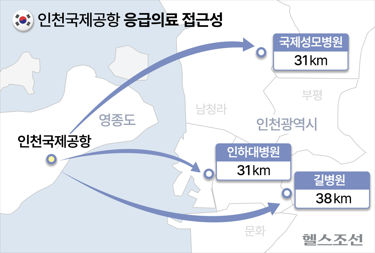 ÇØ¿Ü ÁÖ¿ä Çãºê°øÇ×°ú ºñ±³Çϸé ÀÎõ°øÇ×ÀÇ ÀÇ·á ÀÎÇÁ¶ó´Â ´õ¿í ¶Ñ·ÇÇÏ°Ô ´ëºñµÈ´Ù. ÀϺ» ³ª¸®Å¸°øÇ×Àº 6.1km, ¿µ±¹ È÷µå·Î°øÇ×Àº 6.5km, ½Ì°¡Æ÷¸£ âÀ̰øÇ×Àº 7.3km À̳»¿¡ ÀÀ±Þ¼ö¼úÀÌ °¡´ÉÇÑ º´¿øÀÌ À§Ä¡ÇØ ÀÖ´Ù. µµÄì Çϳ״ٰøÇ× Àαٿ¡´Â Á¾ÇÕº´¿øÀÌ 11°÷, âÀ̰øÇ× 8°÷, īŸ¸£ Çϸ¶µå°øÇ× 7°÷, µ¶ÀÏ ¹ÀÇî°øÇ× 5°÷, È«Äá°øÇ× 4°÷ÀÌ ¹èÄ¡µÅ ÀÖ´Ù. ÀÎõ°øÇ׿¡¼ °¡Àå °¡±î¿î Á¾ÇÕº´¿øÀº °¢ 31km ¶³¾îÁø °÷¿¡ ÀÖ´Â ÀÎÇϴ뺴¿ø°ú ±¹Á¦¼º¸ðº´¿øÀÌ´Ù.
