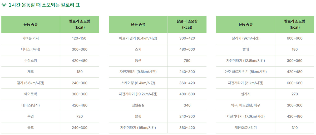 °Ç° »óÅÂ¿Í Èï¹Ì µî¿¡ µû¶ó ÀûÀýÇÑ ½ÅüȰµ¿À» °ñ¶ó ½ÇõÇϼ¼¿ä. ´ëÇÑ´ç´¢º´ÇÐȸ¿¡ µû¸£¸é, ÇÏ·ç 300kcal ÀÌ»ó ¼ÒºñÇÒ ¼ö ÀÖ´Â ¿îµ¿À» ÇÏ·ç 30ºÐ~ÇÑ ½Ã°£¾¿ ²ÙÁØÈ÷ ÇÏ´Â °Ô ÁÁ½À´Ï´Ù. ¿îµ¿ Á¾·ùº° ÇÏ·ç ÇÑ ½Ã°£ ¿îµ¿ÇßÀ» ¶§ ¼Ò¸ðµÇ´Â Ä®·Î¸® ¼Ò¸ð·®Àº ´ÙÀ½°ú °°½À´Ï´Ù(Ç¥). Âü°íÇØ ½ÅüȰµ¿ ´Ã·Á°¡¼¼¿ä!