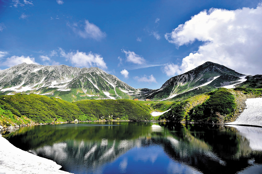 잔설이 남은 산과 하늘이 알펜루트 무로도 고원의 미쿠리가이케 호수에 비친다. /비타투어 제공