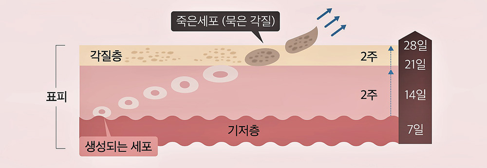 피부의 가장 바깥층인 표피는 기저층에서 새로운 세포가 생성돼 각질층까지 이동한 뒤 자연스럽게 탈락하는 과정을 되풀이한다. 이를 '턴오버'라고 하는데, 건강한 피부의 경우 평균 약 28일 주기로 턴오버가 진행·반복된다.